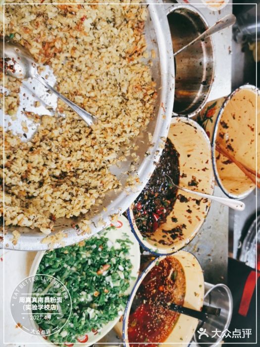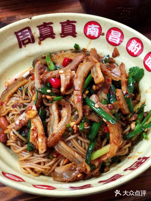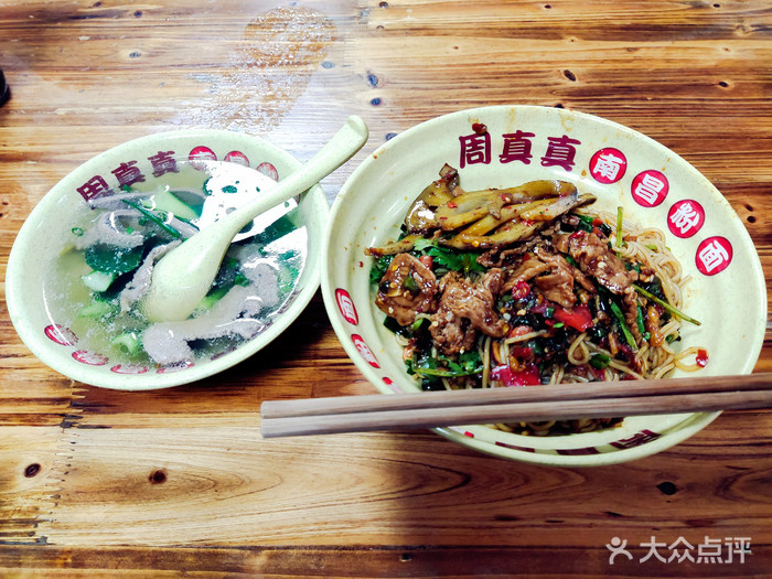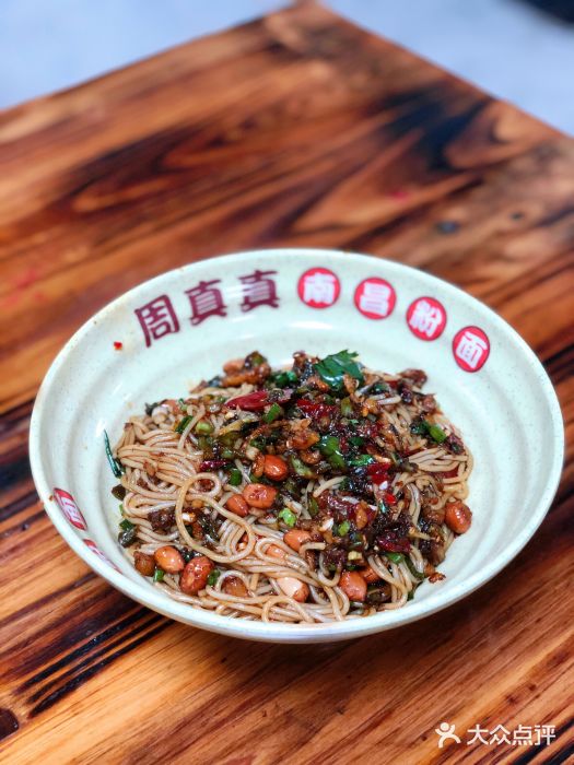 周真真南昌粉面(实验学校店)地址:红谷滩全融大街488号3号商铺南昌第一顿早餐,无雷甚是满意・入店环境稍凌乱点餐很迅速,拿着单去排队领粉图四,牛肉拌粉,价格不贵,用料非常实诚,香菜,大蒜,大葱,藕片,丰富还有牛筋,美味 图五,牛肚拌粉,食材新鲜,调味佳,所有的配料加点醋风味更佳 图六,猪肝蛋汤,猪肝非常嫩图七,红豆汤,红豆煮的很烂,甜度稍高。一天非常舒服的开端,起飞