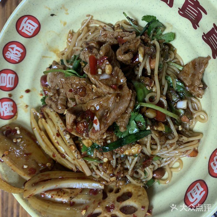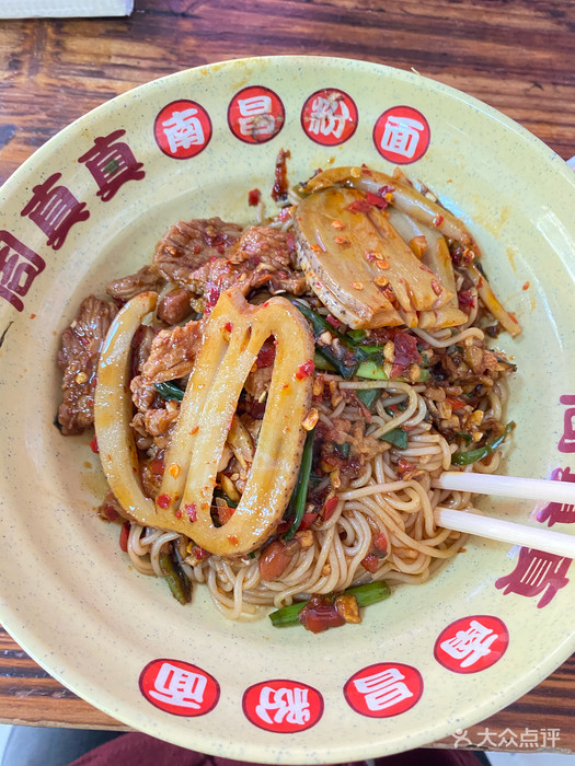 在实验中学的旁边,店内大喇叭循环播放“"门口和对面都不能停车”,可见有多少人在这里吃了罚单。进店消费流程先到收银台点餐买单获取小票,拿着小票去拌粉窗口排队领取自己的拌粉,小票不需要上交,带着拌粉和小票找桌子坐下,过一会儿会有阿姨端着汤满屋子喊小票号码,凭小票喊阿姨送汤过来。我来了两次,8元的肉饼汤都卖完了,第一次点了嫩牛肉汤,清清爽爽的,还不错,第二次是藕泥肉丸汤,汤很浑浊粘稠,也还行吧。拌粉拌面无论什么口味,都是先把粉面拌好,然后根据你点的浇头加上去,例如牛肉拌粉就是“南昌拌粉+牛肉”,竹拌粉就是“南昌拌粉+腐竹”,我吃了三种,感觉都挺不错的。为什么来了两次吃了三种呢,因为第二次来的时候我还打包了一碗带在火车上吃,哈哈哈哈,足以看出来他家有多么好吃了吧?!(ps:我觉得他家的拌面拌粉要好吃)