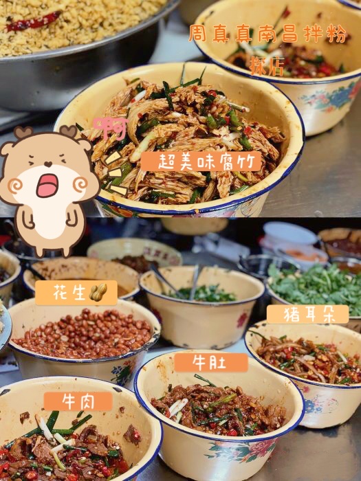 网友点评一:和我曛风,Lv6人均:25元来周真真家之前没有吃过南昌拌粉,去滕王阁夜游之前来这家,才晚上7∶30不到,还在饭点呢,它家生意太好,来的时候,卤牛肉拌粉只剩我这最后一份,哈哈,可惜甜汤啥的没有了给老爸点了牛肚和腐竹选2样拌粉,都特别好吃,瓦灌汤比庐山的便宜还好喝!绝美然后成功在21:00前进景区,被贴上登阁的......