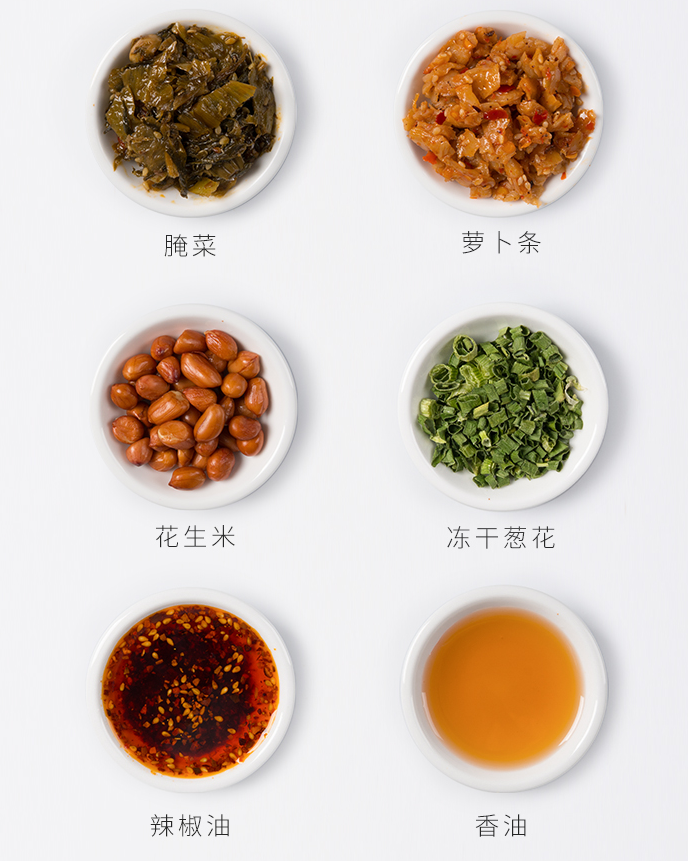 酱汁、辣椒油、醋、香油、腌菜、萝卜条、葱花 、花生。这排面,可以说和南昌街边的豪华配置差不多丰富了。